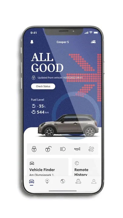 Con las funciones de servicio de la nueva MINI App, puedes gestionar con facilidad las necesidades de servicio y mantenimiento de tu MINI. Podrás recibir notificaciones útiles cuando tu MINI necesite mantenimiento, concertar citas de servicio y solicitar asistencia en carretera directamente desde la MINI App.