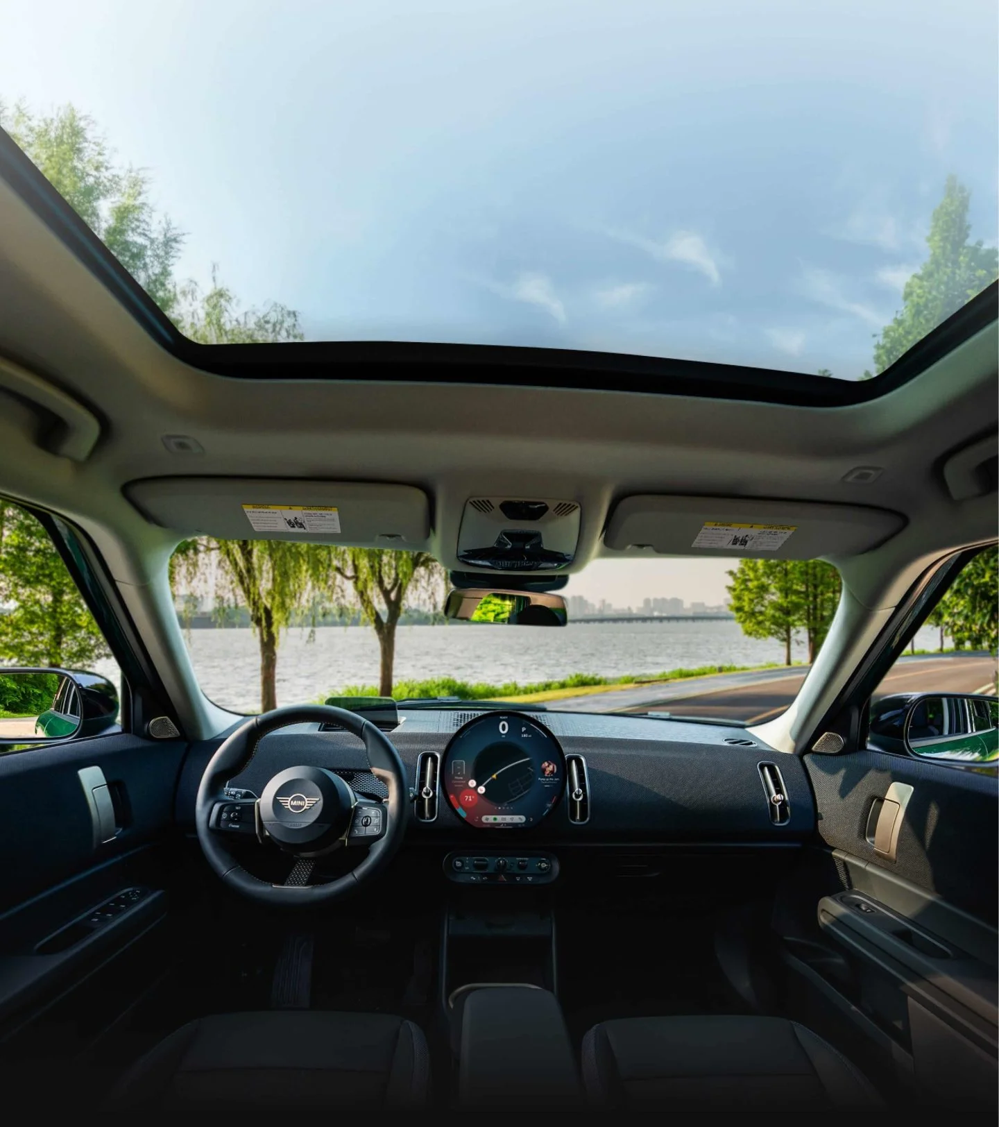 Añade color y nubes a tus viajes diarios con un amplio techo panorámico que adorna el techo de tu Countryman sin costo adicional.